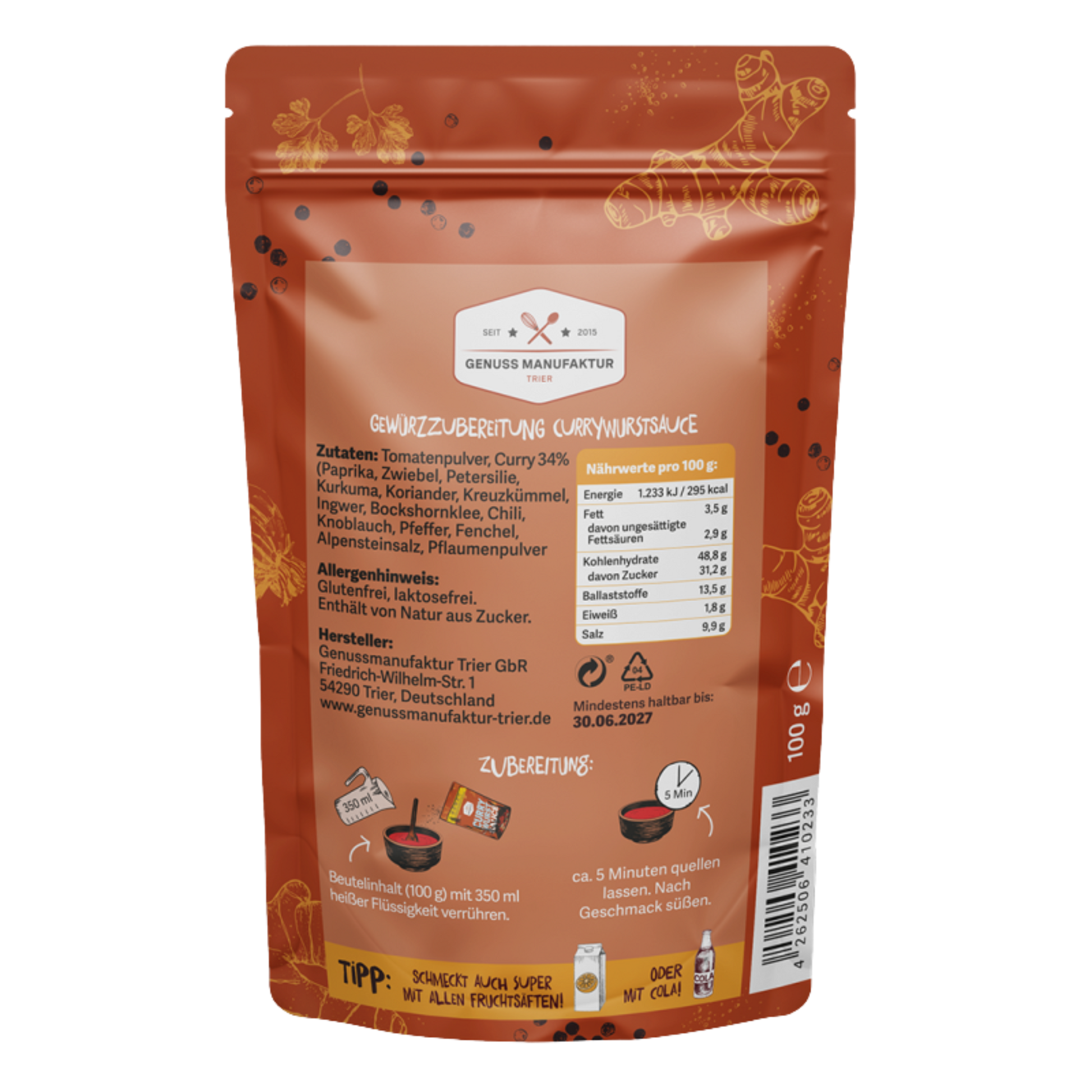 Wow! Endlich sind die Produkte der Genussmanufaktur Trier auch bei uns erhältlich! Mit dieser „Currywurst Sauce“ holst du dir den echten Street-Food-Geschmack direkt auf deinen Teller. Ob zu knackigen Bratwürstchen, gebratenen Würstchen, Pommes, Ofenkartoffeln oder als Dip — die Sauce ist wandelbar und begeistert durch fruchtig-würziges Aroma und typisch deutsche Currywurst-Note.