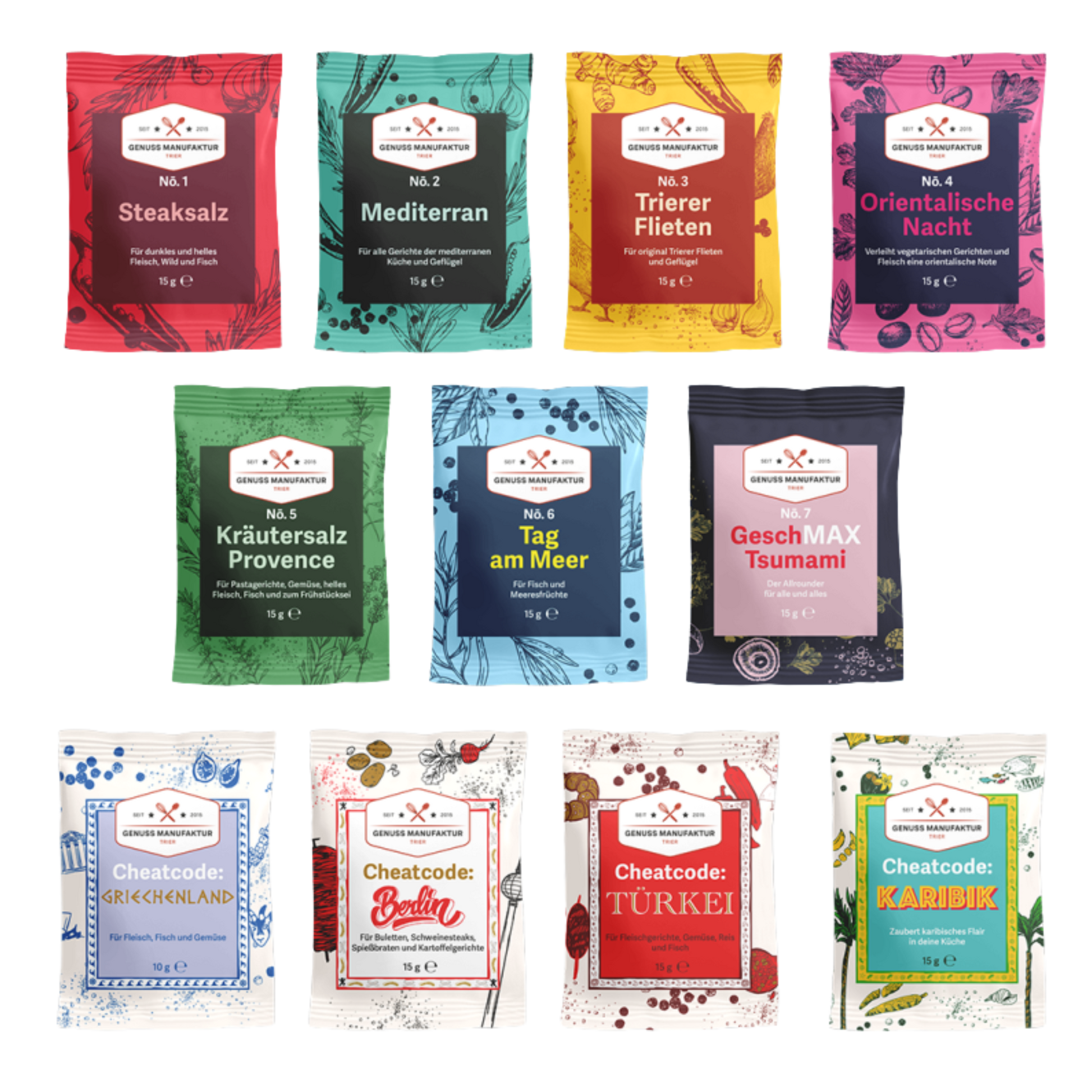 Eine Auswahl aus 11 verschiedenen Gewürz- und Saucenmischungen der Genussmanufaktur Trier.
