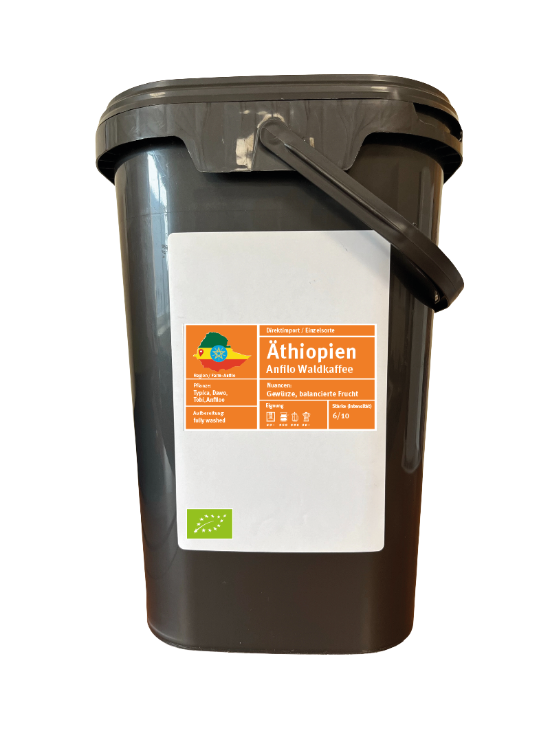 Der Äthiopien Anfilo Waldkaffee stammt aus der bergreichen Region Wällägga, wo er seit über 500 Jahren in seiner ursprünglichen, wildwachsenden Form gedeiht. Die Kaffeepflanzen wachsen in den Regenwäldern unter natürlichen Bedingungen, ohne den Einsatz von chemischen Düngemitteln oder Pestiziden.