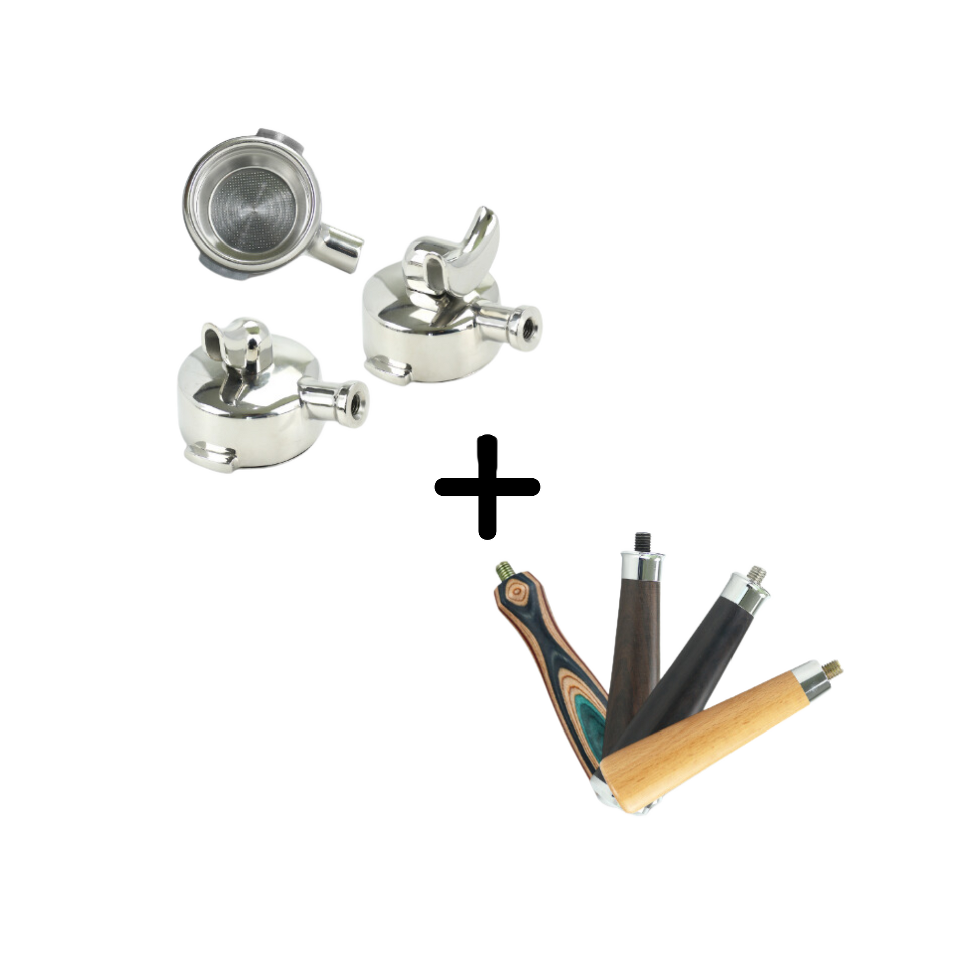 Du hast die Wahl aus drei hochwertigen Siebträgerköpfen – ob 1er, 2er oder bodenlos – und kombinierst sie frei mit einem von vier ergonomisch geformten Griffen aus Buchenholz: