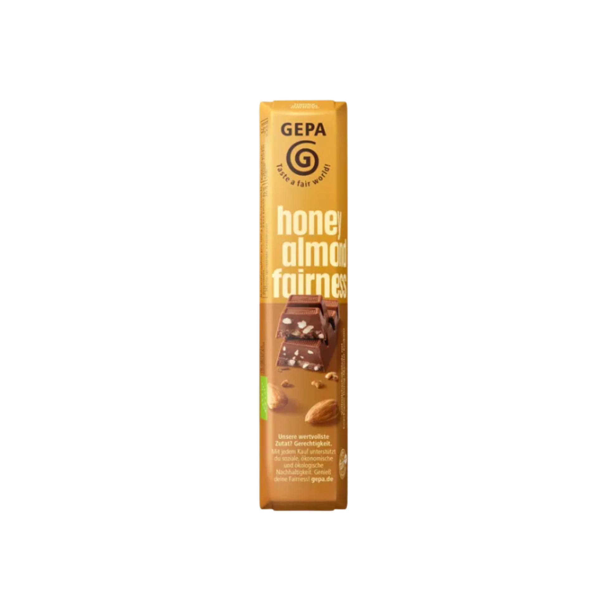 Genieße edle Bio-Vollmilchschokolade, verfeinert mit knusprigem Honig-Mandelkrokant. Die intensiv aromatische Textur entsteht durch schonendes Conchieren – ganz ohne Emulgatoren. Verpackt in Papier mit einem kompostierbaren Innenwickel. Mit lokalen Naturland-Milch und hochwertigem Kakao, entsteht Genuss mit Verantwortung. Fair-Handelsanteil: 98 %