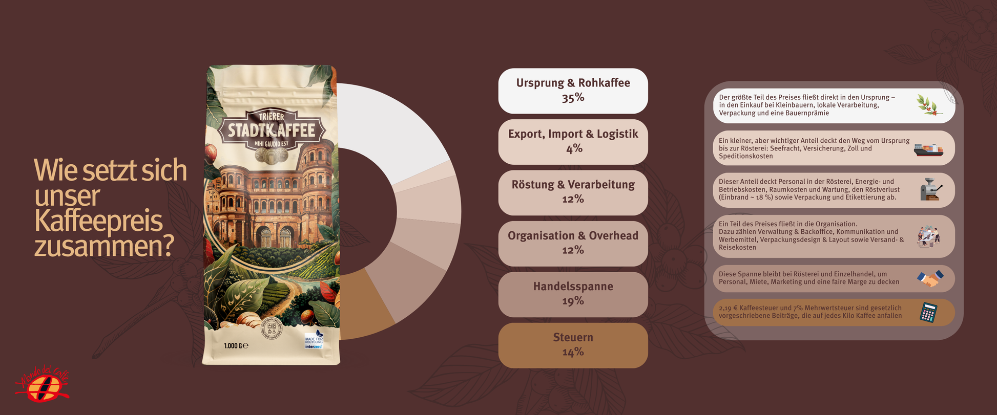 Dieser Kaffee ist ein gemeinsames Projekt der lokalen Agenda 21, des Weltladens/Trier und der Kaffeerösterei Mondo del Caffè.